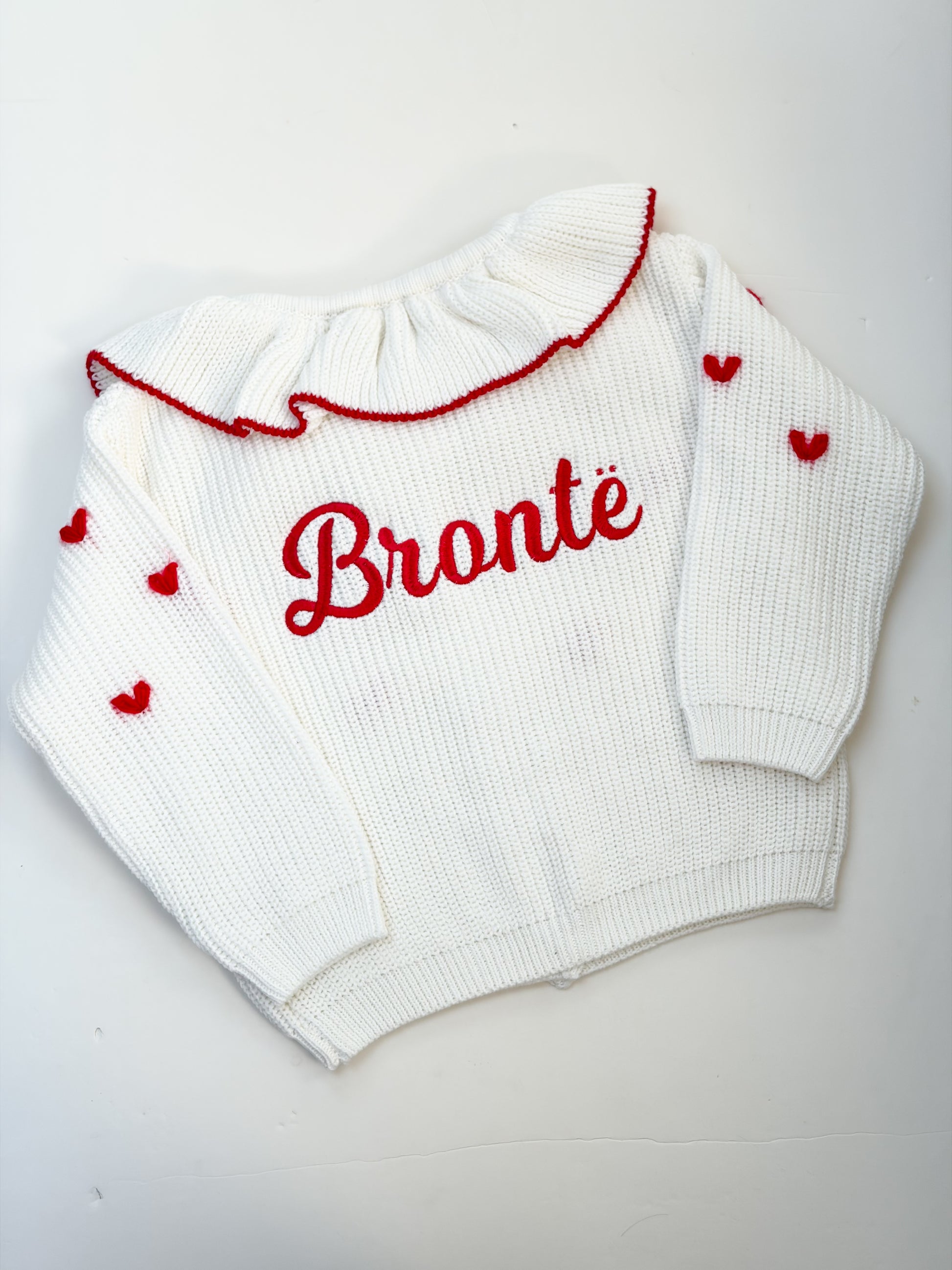 Personalised knitted cardigan with embroidered hearts